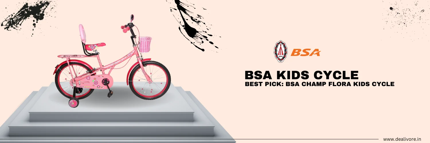 | 2 | BSA Champ Flora for Girls | 20 inch wheel size, 18 inch rigid steel frame & 15.19 kg weight. | Cantilever brake & mud flaps. | Designed especially for girls in learning stage. | It is a fantastic cycle for kids offering great performance, durable quality and thoughtful features like a backrest, basket and bell ensuring a delightful riding experience. | ₹7,969 |